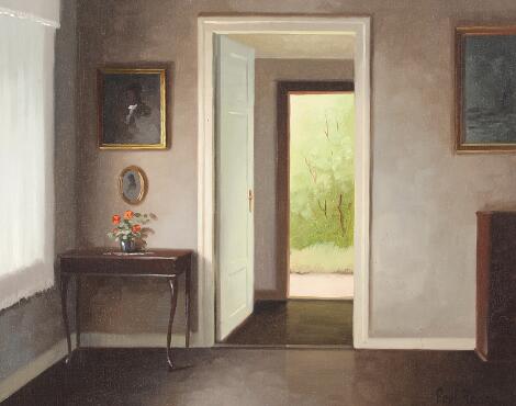 2549/345Poul Rønne: Interior with view to the garden. Signed Poul Rønne. Oil on canvas. 40 x 50 cm.
