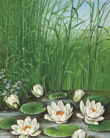 2549/344Painter unknown, 19th century: Water lilies in a pond. Unsigned. Oil on canvas. 44 x 35 cm.