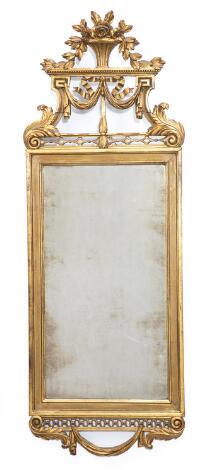 Stort Louis XVI spejl af forgyldt træ. Spejlglas formentlig oprindeligt. Ca. 1780. H. 165. B. 60.