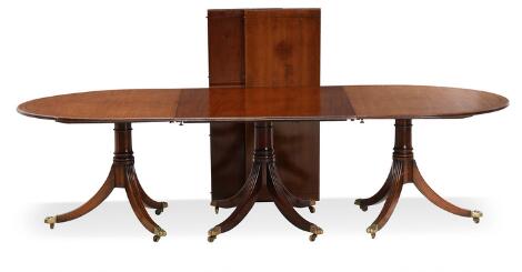 Engelsk three-pillar table af mahogni med afrundede endestykker og to tillægsplader. 19. årh.s første halvdel. H. 71. L. 276/366. B. 120.