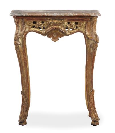 Italiensk konsol af forgyldt træ med plade af marmor. Delvis, 18. årh. H. 89. B. 72. D. 41.
