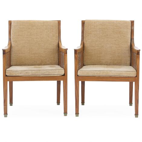 Et par bergere af mahogni, sider og ryg af fletværk med løse hynder, sabots af messing. 20. årh. (2)