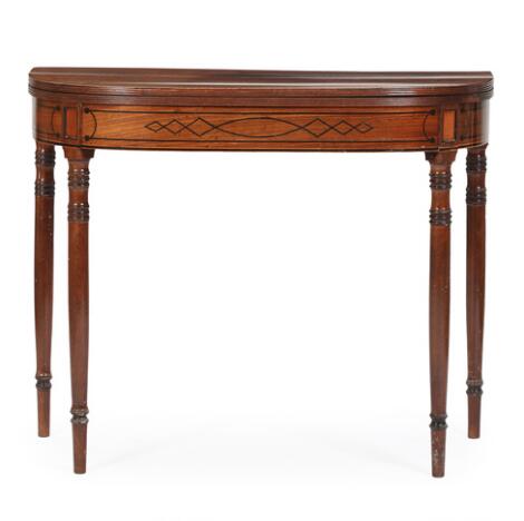 Empire spillebord af mahogni, indlagt med intarsia, indvendigt beklædt med grønt filt. 19. årh.s begyndelse. H. 74. B. 90. D. 44/88.