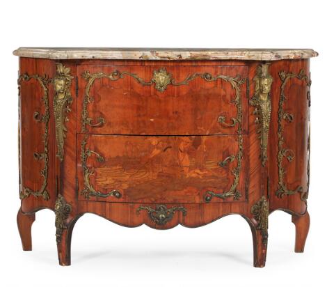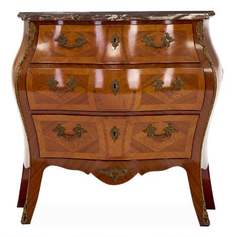 Svensk kommode af rosentræ indlagt med parquetteri, plade af rødbroget marmor. Louis XV stil, 20. årh.s anden halvdel. H. 76. B. 82. D. 44.