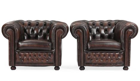 Et par chesterfield lænestole af dybhæftet, mørkebrunt skind. 20. årh. (2)