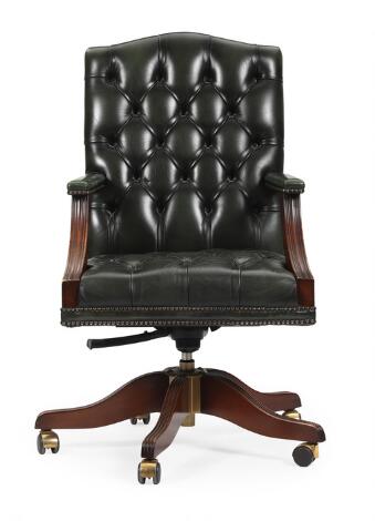 Chesterfield kontorstol betrukket med dybhæftet grønt skind, stel af mahogni, hjul af messing. 20. årh.