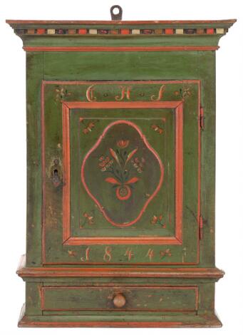 Almue hængeskab dekoreret i farver, front med dør bag hvilken hylder og to små skuffer. 19. årh.s midte. H. 80. B. 59. D. 31.
