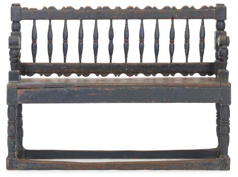 Almue foldebænk af bemalet træ, med vendbar tremmeryg og snoede ben hvorimellem sprosser. 19. årh.s midte. H. 95. B. 130. D. 40.