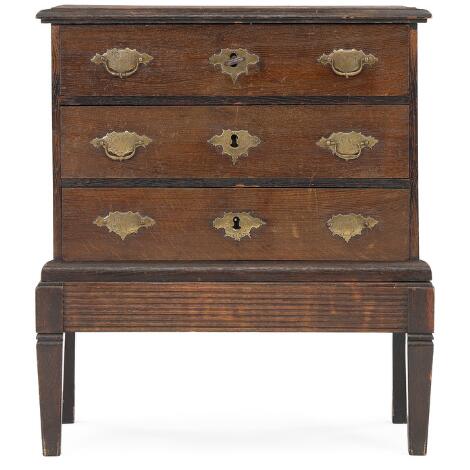 Lille kommode af egetræ med tre skuffer og beslag af messing, på løs underdel med rillede ben. 18. årh.s slutning. H. 77. B. 67. D. 37.