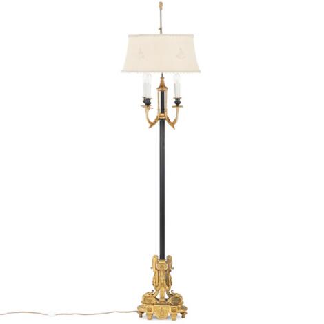 Fransk standerlampe af forgyldt og patineret bronze med fire lysarme monteret til el., justerbar skærm af silke. 20. årh.s begyndelse. H. 193. Diam. 48.