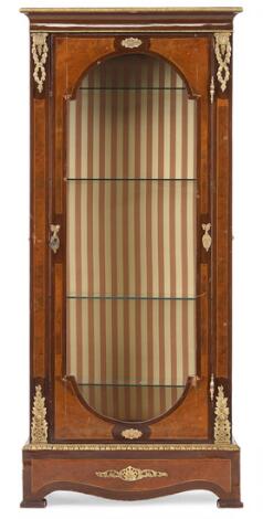 Vitrineskab af mahogni med beslag af forgyldt bronze, front og sider med glas, indvendig betrukket med stribet silke. 20. årh. H. 126. B. 58. D. 36.
