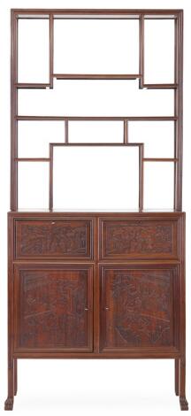 Netsukeskab med etageoverde af hardwood. Ca. 1900. H. 204. B. 92. D. 41.