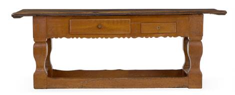 Langbord med plade af egetræ og underdel af ådremalet træ, front med lille og stor skuffe. 19./20. årh. H. 76. L 205. B. 87.