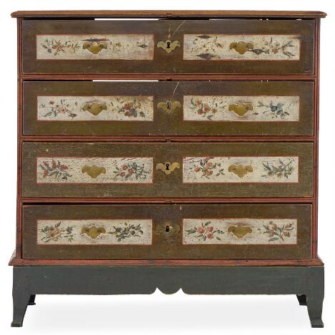 Almue dragkiste af bemalet fyrretræ dekoreret med blomster, front med fire store skuffer. 19. årh.s midte. H. 105. B. 118. D. 62.