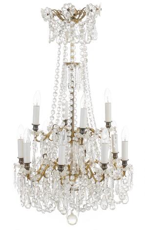 Fransk prismekrone med 12 lysarme monteret til el. i to etager, behængt med prismer. 19. årh.s slutning. H. 90. Diam. 54.
