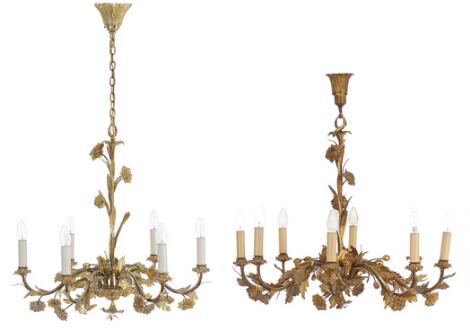 To franske lysekroner af forgyldt metal med blomster, den ene med seks lysarme og den anden med otte lysarme monteret til el. 19. årh.s slutning. H. 60 Diam(2)