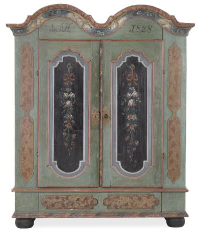 Dansk almue barokskab af bemalet og dekoreret træ. Flade kugleben. Dateret 1828. H. 200. B. 170. D. 53.