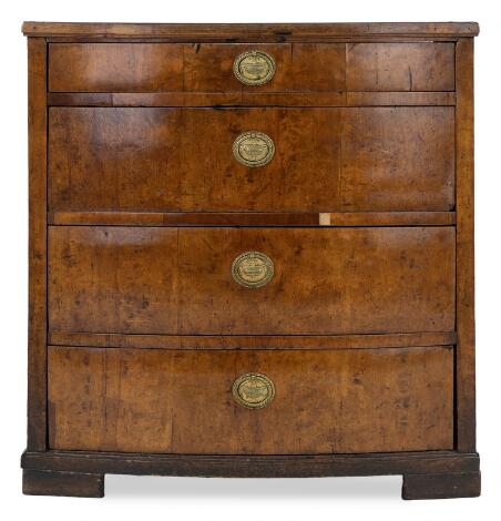Dansk empire kommode af birketræ, med buet front. Ca. 1820. H. 81. B. 76. D. 49.