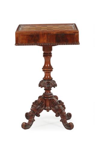 Nyrokoko skakbord af mahogi med indlægninger af lyst træ. 19. årh. H. 70. B. 42. D. 42.