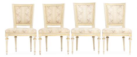 Et sæt på fire næste ens sengustavianske stole af senere bemalet og guldstafferet træ. Sverige, 19. årh. (4)