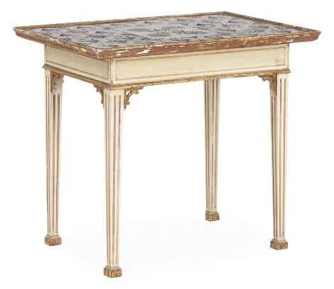 Dansk flisebord af bemalet og delvist forgyldt træ. Plade med 24 fajancefliser. Bordstel 20. årh.s begyndelse, fliser ca. 1820. H. 75. B. 84. D. 58.