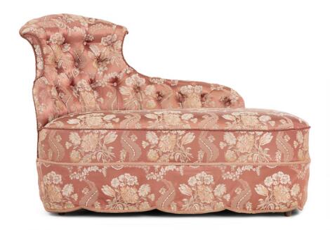 Chaiselong nyligt betrukket med blomstret silke, dybthæftet knapper. 19. årh.s slutning. H. 86. L. 120. D. 70.