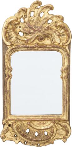 Rokoko spejl af forgyldt træ. 18. årh.s midte. H. 60. D. 30.