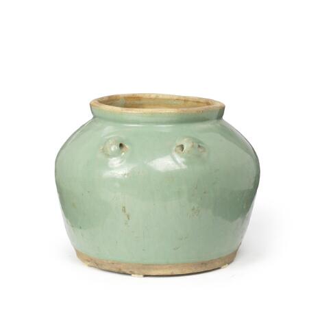 2551/4150LyngbyVase af porcelæn med fire små ørehanke, dekoreret med blågrøn glasur. Sen Qing. H. 20 cm.
