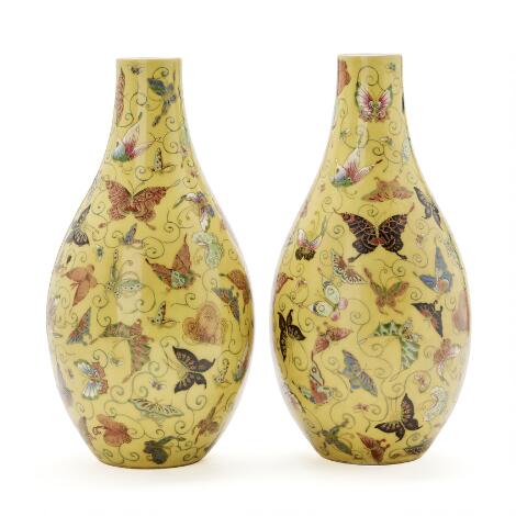 2551/57LyngbyA pair of Chinese 'butterfly' yellow-ground bottle vases, Qianlong seal mark but 20th century. H. 29 cm. (2)