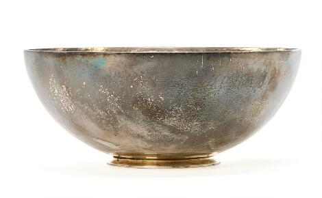 Per Sax Møller: A circular sterling silver bowl with hammered surface and relief decor. Weight 867 g. H. 8.3 cm. Diam. 28.2-28.6 cm.