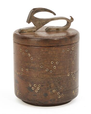 2603/3024LyngbySvend Weihrauch: Tobakskrukke af moseeg, lågknop i form af liggende hjort beklædt med sølv. 1930-40'erne. H. 16 cm.