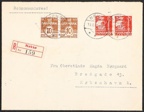 1928. 15 øre, red and 10 øre, red-brown. 2 HEAVILY MIS-PERFORATED PAIRS on REC-cover from NEKSØ 14.10.40. Cert. Nielsen