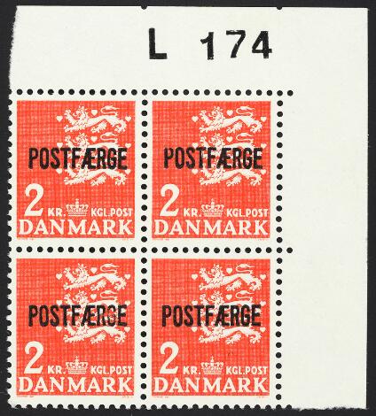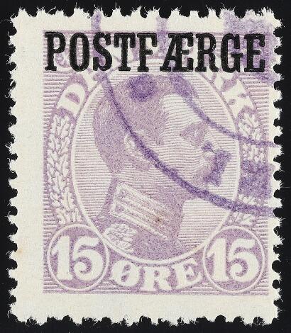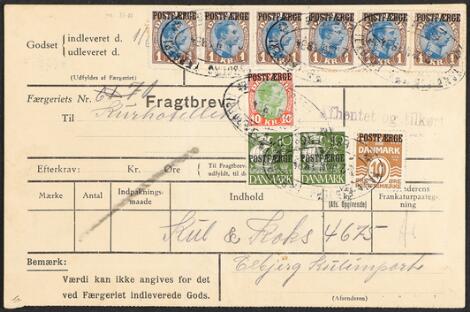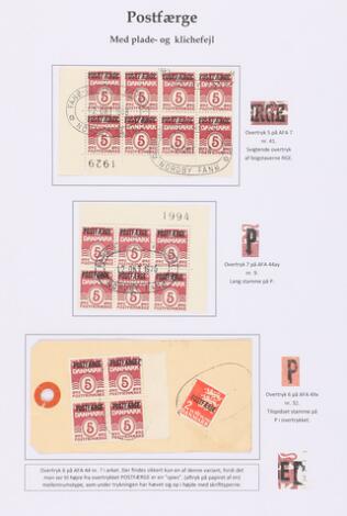 Postal Ferry. Coll. on 10 pages with various overprintvarieties incl. Chr. X, 15 øre POSFFÆRGE and Wavyline, 5 øre block of 4 with large SPIES afetr E etc.