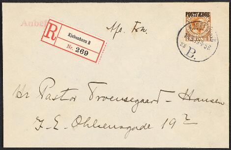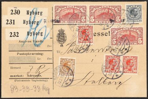 1919. Posthus, 5 kr, vm kors. 3 stk. hvoraf en er med variant KJØBFNHAVN samt diverse Chr. X med 2 Kr. og 1 Kr. og 3 stk. 10 øre givende ialt 1830 øre på Adress
