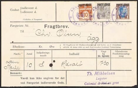 1923-30. Chr. X, 50 øre og 1 kr samt Bølgeline 10 øre, RØDBRUN. Ialt 1 kr og 60 øre på fragtbrev fra Løgstør til Aggersund stemplet med violet kronestempel AGGE