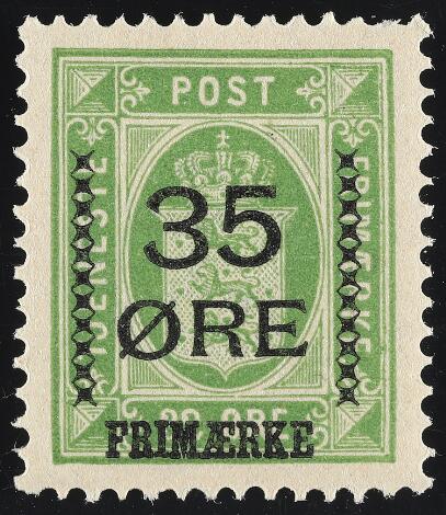 1912. Overprint. 35/32 øre, yellowgreen. SUPERB centic MNH copy. Very rare stamp in this conditio. AFA 15.000