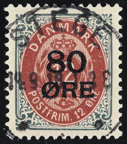 1915. Overprint. 80/12 øre, grey/red. Pos. 51 with INVERTED FRAME. SUPERB upright canc. STEGE 14.9.18. Very rare. Cert. Nielsen EXCELLENT COPY