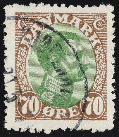 1918. Chr.X, 70 øre, 5.print, pos. 98 with variety "THICK NUMBERS". Fine used copy of this EXCEEDINGLY RARE VARIETY. Small imperfection on the left side of no