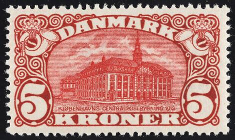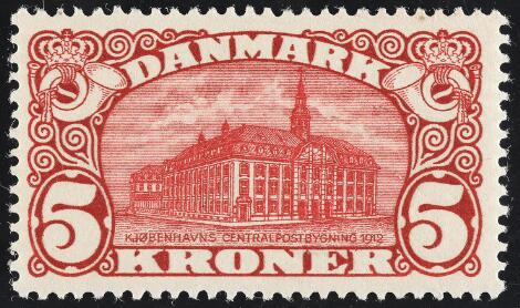 1912. 5 Kr. General post office, brown-red. Vm.III. PERFECT MNH copy. Cert. Lars Jørgensen.