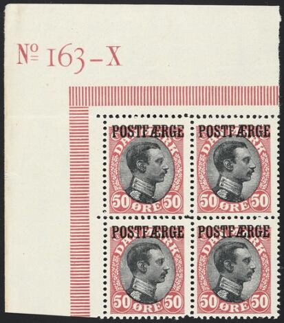 1919. Chr. X, 50 øre, vinrød/sort. Postfrisk 4-blok med øvre marginalnummer 163-X. Flot og sjælden enhed. Attest LN.