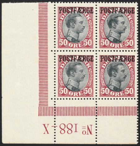 1919. Chr X, 50 øre, vinrød/sort. Postfrisk 4-blok med marginalnummer 188-X. Sjælden!