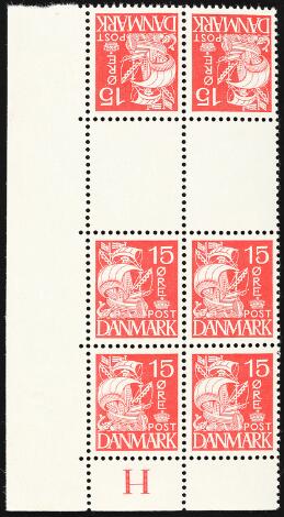 1937. Karavel, 15 øre, type II. Block of 8 with sheet margin WITHOUT NUMBER and only "H" in margin. Very scarce object in very fine MNH condition.