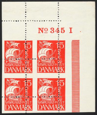 1927. Caravel. 15 øre, red, MISPLACED PERFORATION. Very fine MNH block of 4 with marginnumber 345-I. Hinged in margin.