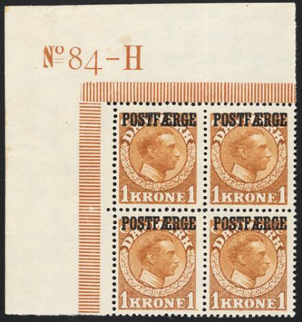 1919. Chr. X, 1 kr. Flot postfrisk 4-blok med øvre hjørnemarginal 84-H. Sjælden marginal 4-blok.