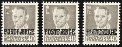 1955. Fr. IX, 40 øre, grå. 3 perfekt postfriske mærker, alle med varianter: Farvestreg i BANG, Plet på O i overtrykket samt DOBBELT OVERTRYK. Sjældne!