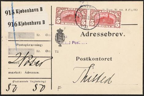 1912. 5 Kr. General post office, brown-red. Vm.III. Pair with variety "KJØBFNHAVN" (1.print, pos. 44-45) on excellent parcel-cover. Cert. Nielsen
