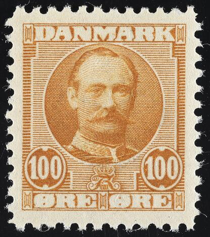 1907. Fr. VIII. 100 øre, yellow-brown. LINE-PERFORATED. Perfect MNH copy. Very rare stamp. Certs. Møller and Nielsen