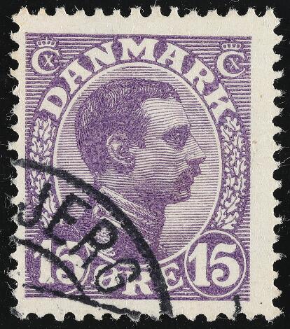 1913. Chr.X, 15 øre, lilac. Variety "Partly missing circle". Fine used copy. AFA 6.000. Cert. Nielsen