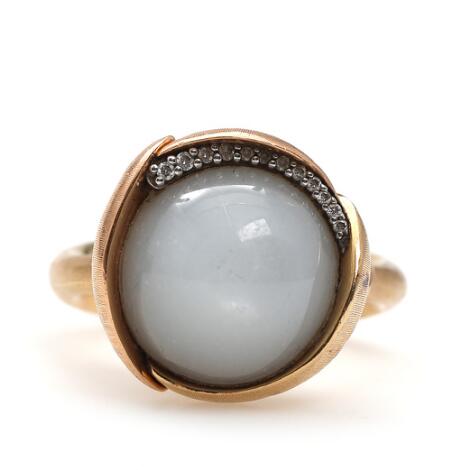 2550/1114AarhusCharlotte Lynggaard: A "Lotus" moonstone ring set with a moonstone and numerous diamonds, mounted in 18k satinated gold and rose gold. Size app. 51.