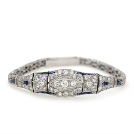 2550/1125AarhusArt Deco sapphire and diamond bracelet, mounted in 14k white gold. L. 18 cm. Weight app. 17.5 g.